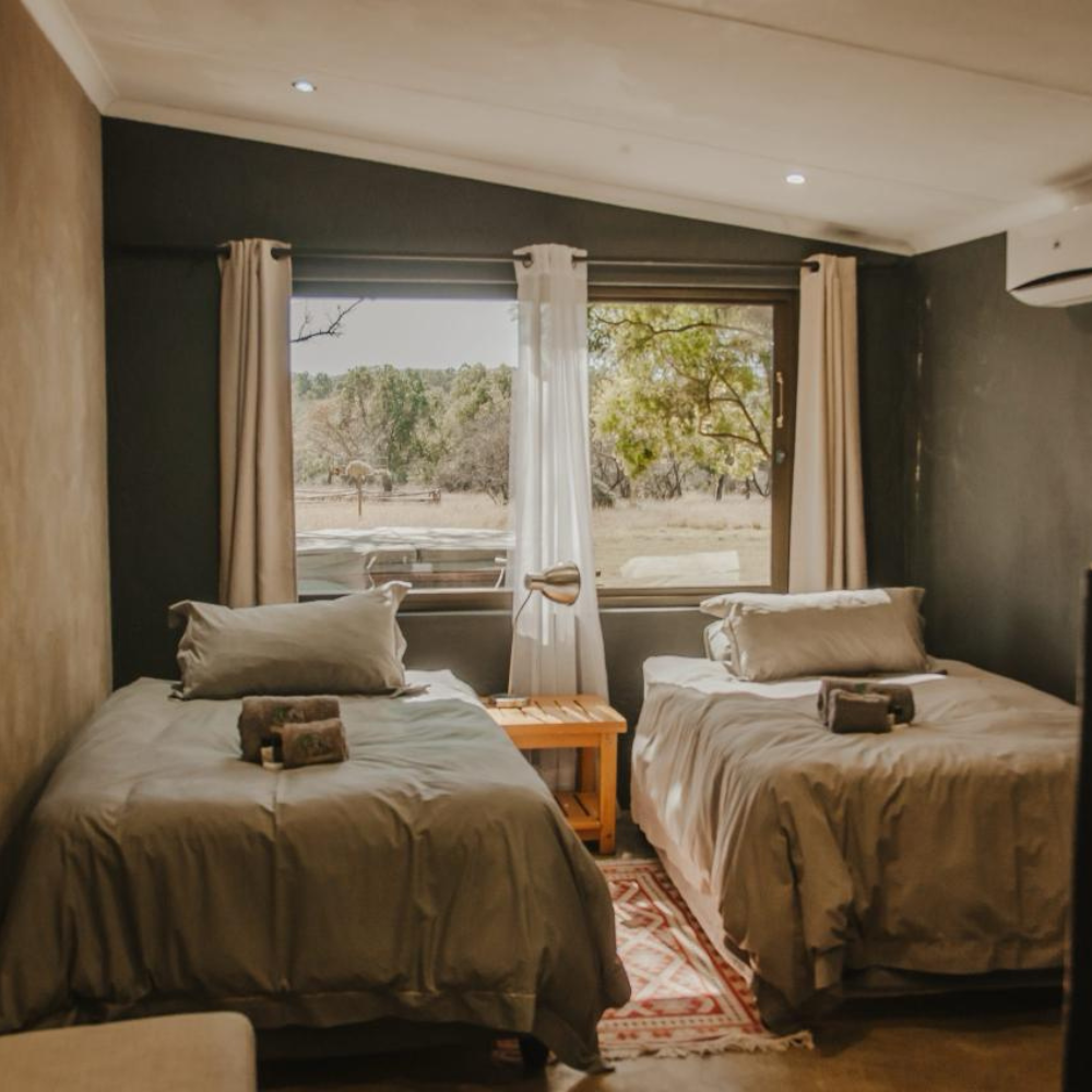 At Blouwildebees Uitsig, each room offers a comfortable and private retreat with modern en-suite bathrooms, air conditioning, and tasteful safari-inspired décor. The spacious rooms feature king-size or twin beds with high-quality linens, ensuring a restful night’s sleep after a day of hunting. Large windows provide stunning views of the surrounding bushveld, while private verandas offer a peaceful spot to relax and enjoy the outdoors. All rooms are equipped with essential amenities, including charging stations and Wi-Fi, to ensure a convenient and comfortable stay.